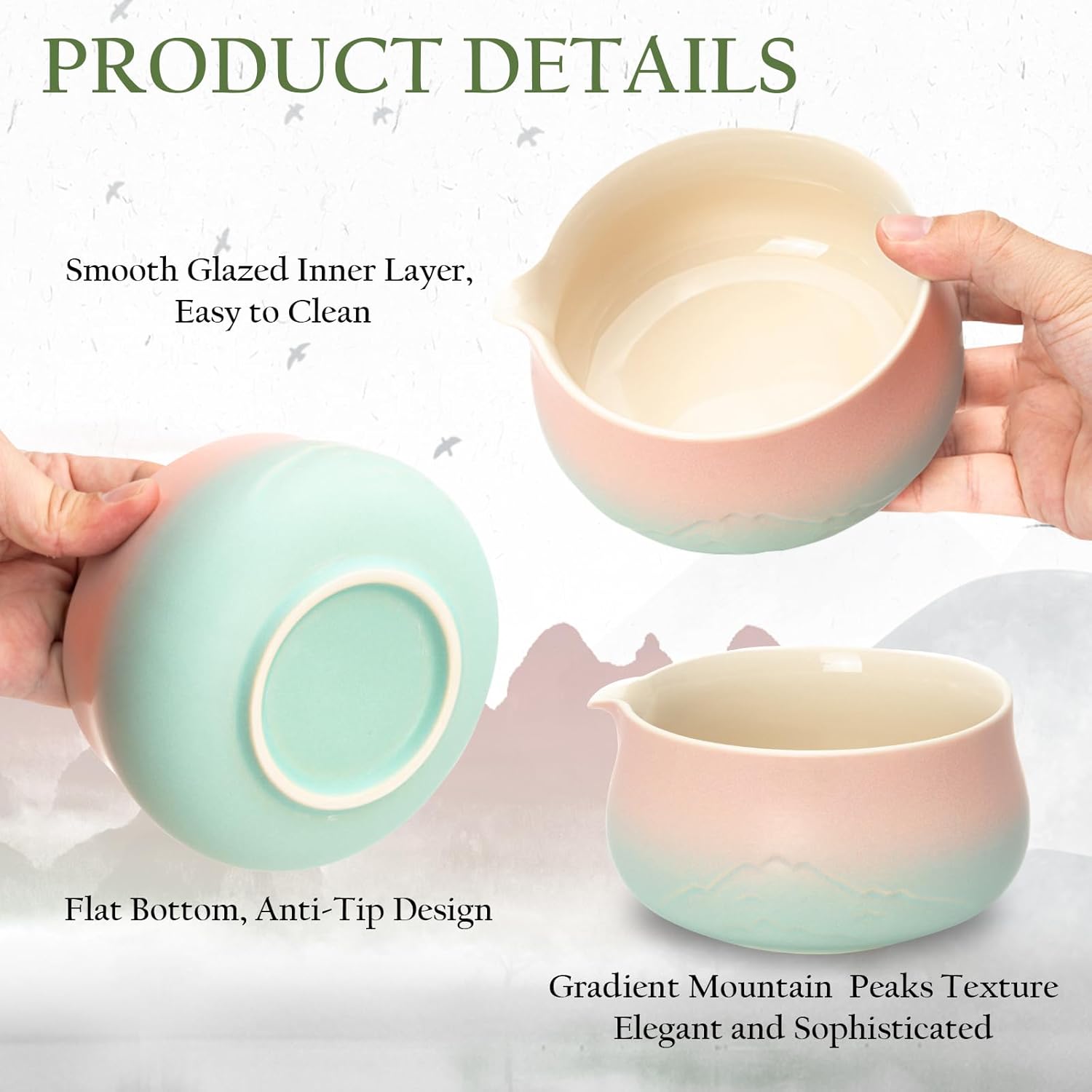 - 【Zen-Inspired Matcha Whisk Set】 Drawing inspiration from ethereal mountain forests, this matcha set features a matcha bowl with a spout finished in a serene pink-to-green gradient. The matcha bowl's surface etched with distant peak motifs that harmonize modern aesthetics with traditional elegance; this artfully crafted ensemble merges practicality with decorative artistry, transforming your matcha preparation into a meditative ritual.