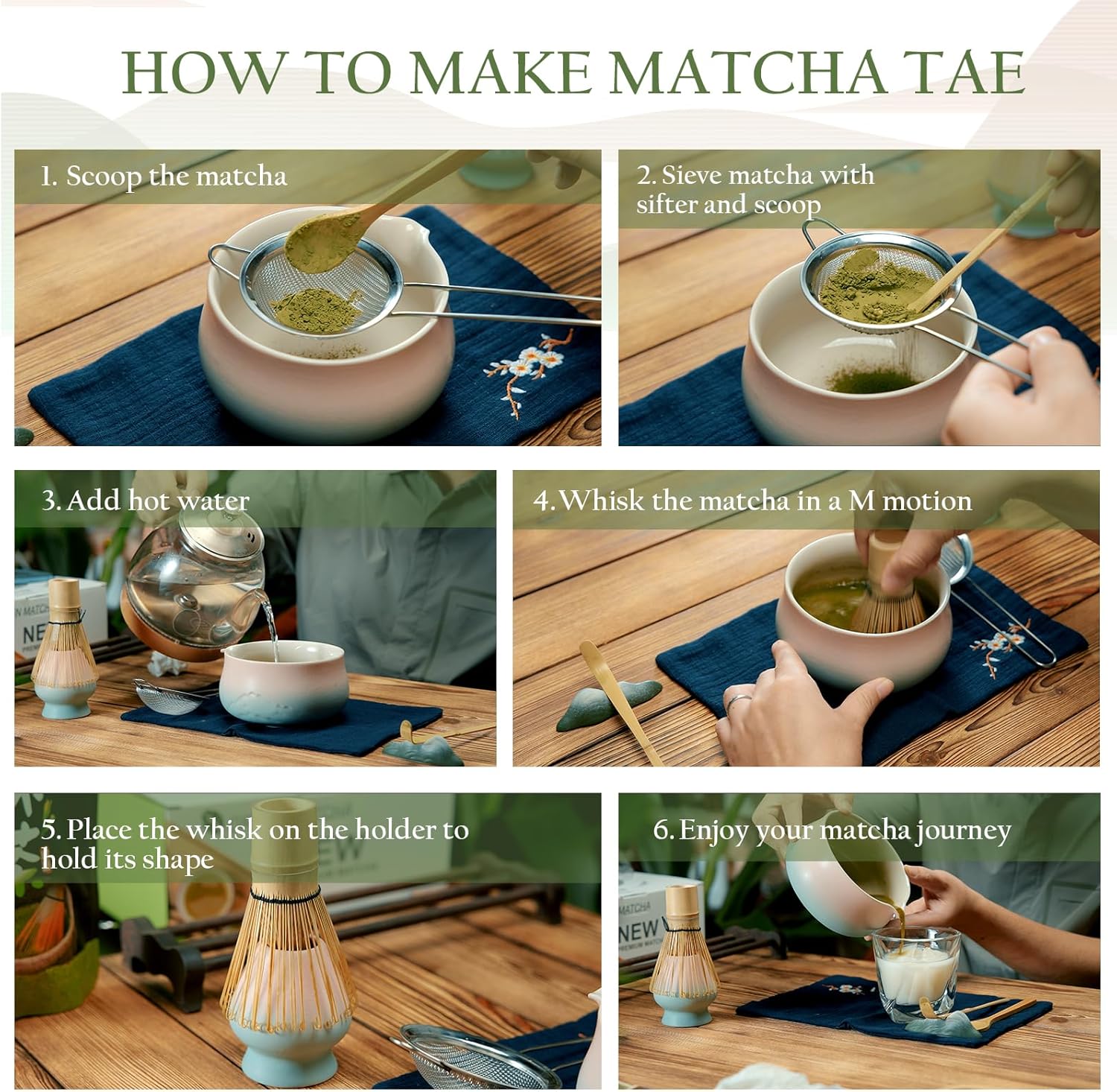 - 【Complete Matcha Making Kit】 This matcha set for matcha enthusiasts includes everything needed to craft authentic matcha: lead-Free Ceramic Bowl*1, Bamboo Whisk*1, Bamboo Scoops*2, Stainless Steel Sifter*1, Scoop Holder*1, Tea Towel*1, Whisk Holder*1—all exquisitely packaged for secure delivery. Featuring detailed brewing instructions printed on the packaging, these meticulously crafted tools empower both matcha starter and connoisseurs to effortlessly prepare perfect matcha tea every time.