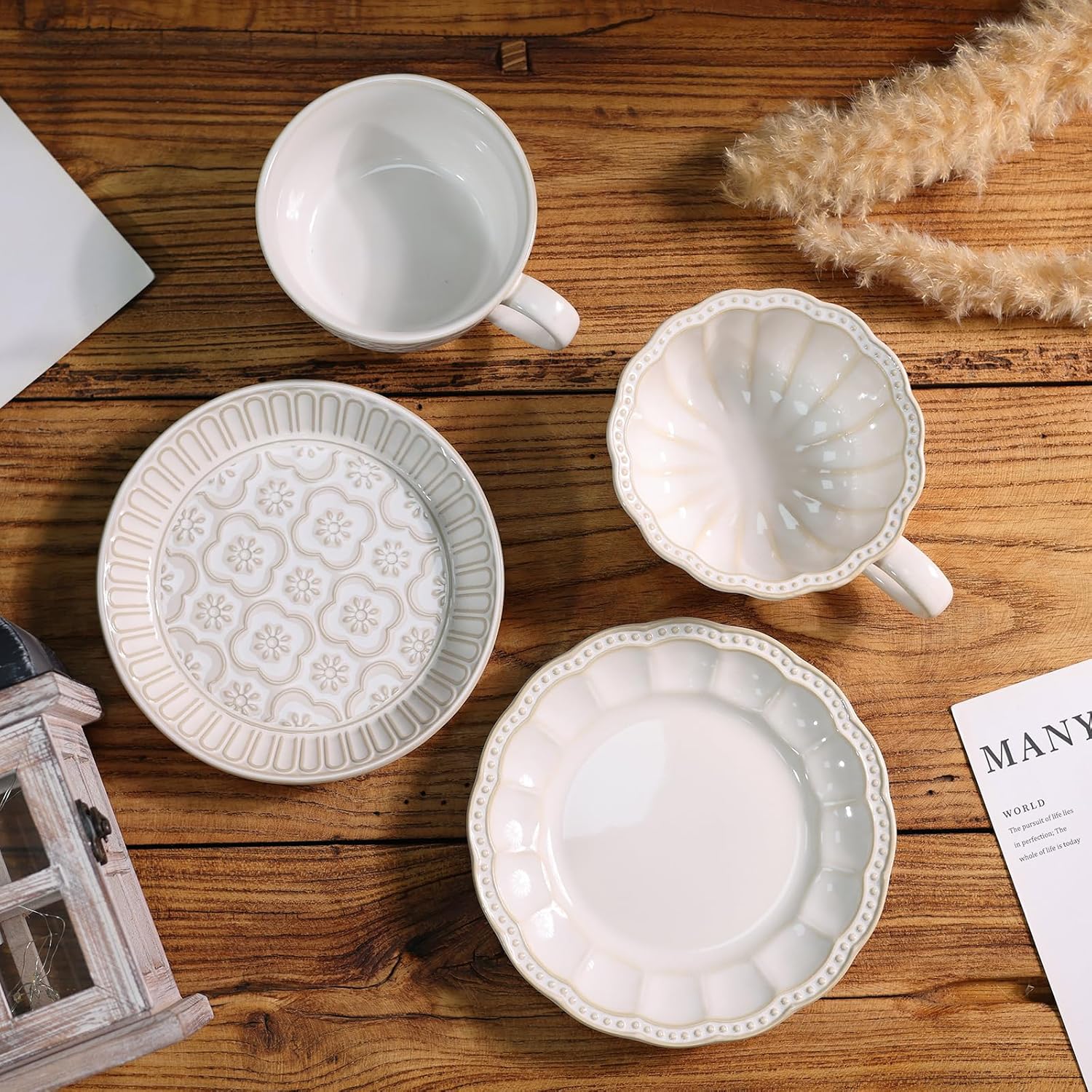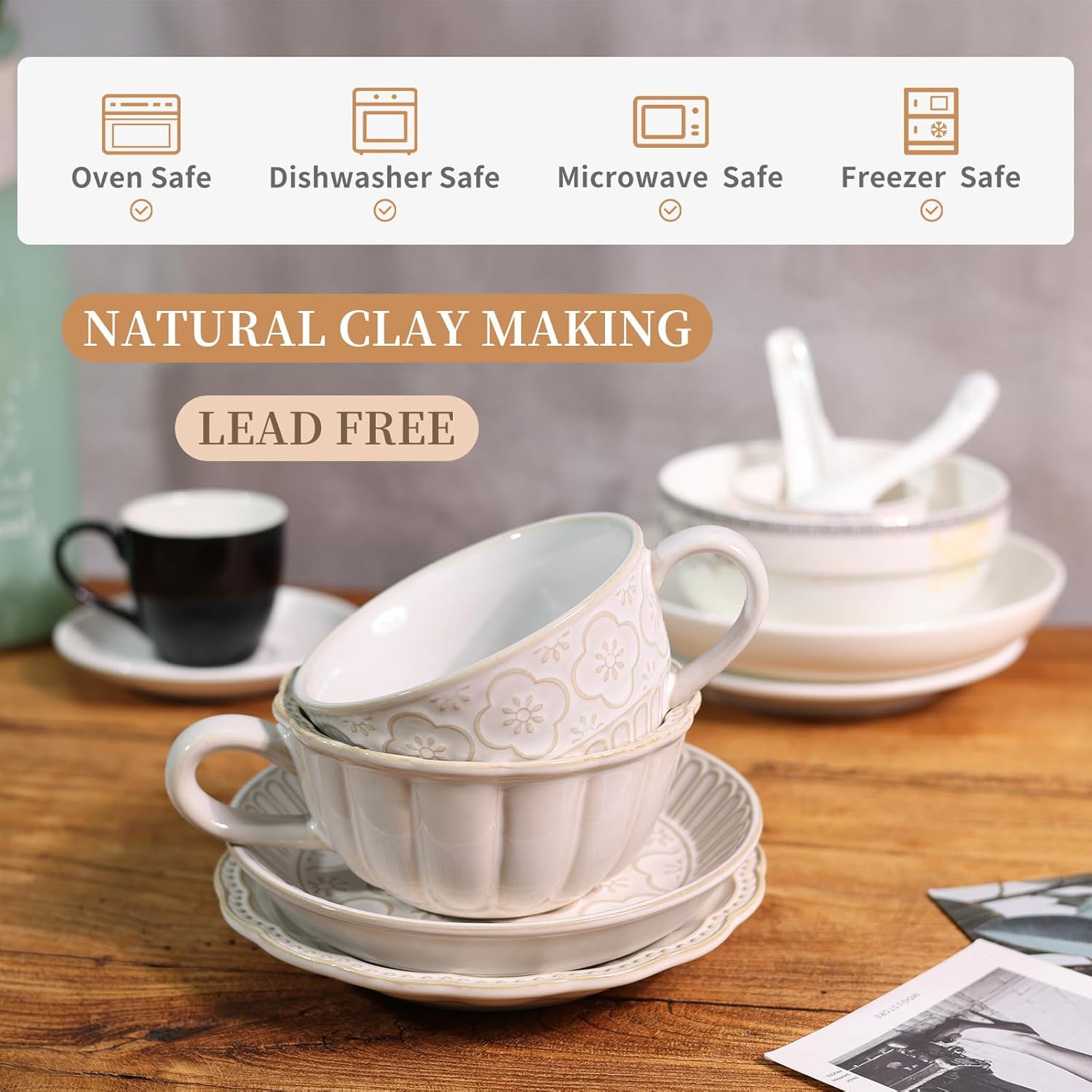 12 OZ Latte Cup with Saucer, Cappuccino Cup Vintage Cafe Art Cups for Espresso Turkish Coffee, Farmhouse Latte Mugs Tea Cups and Saucers Porcelain Set for Christmas Thanksgiving Day Gift