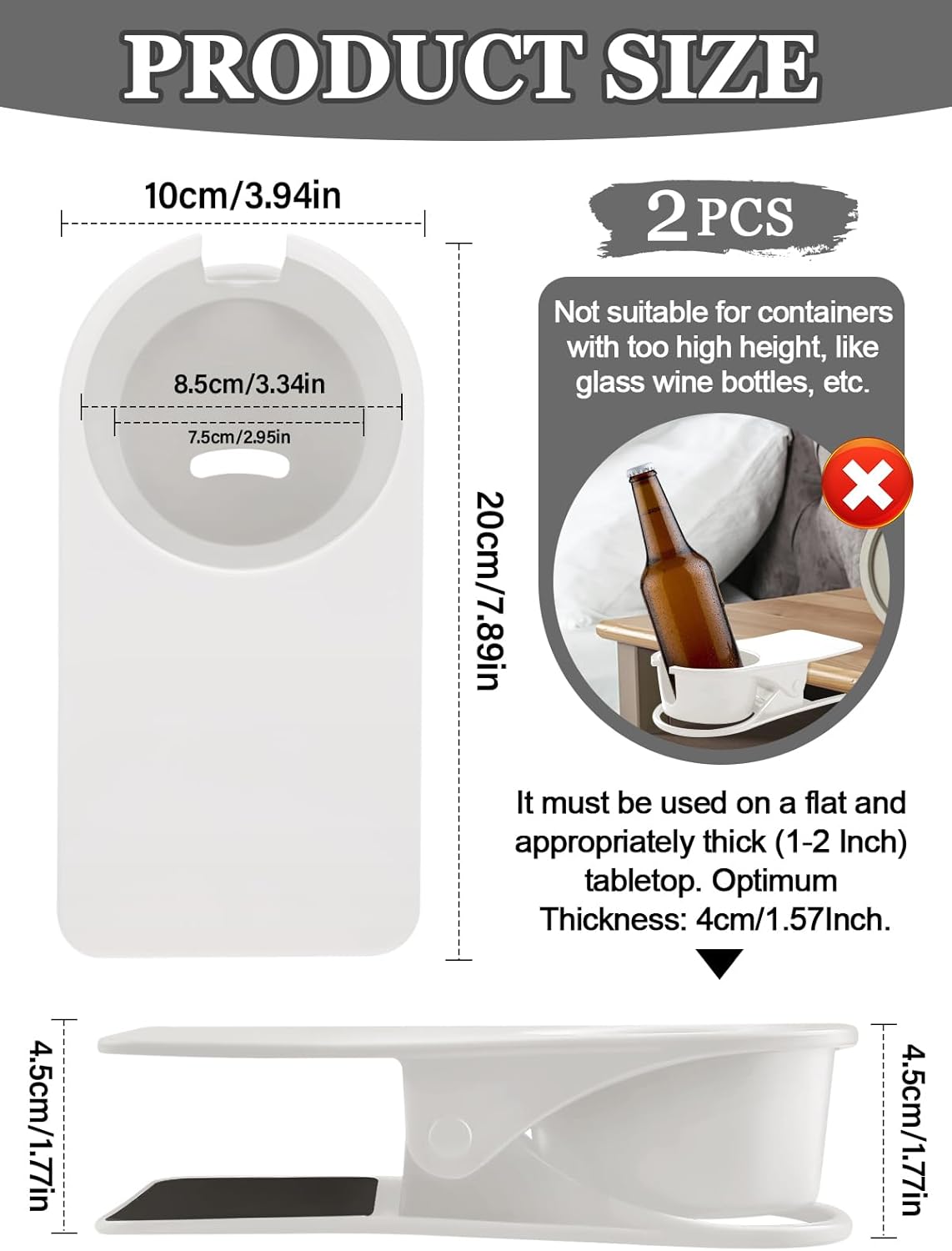 - Keep Your Desktop Tidy: This cup holder clamp has an opening of 3.3 inches and can bear 1 kg. It can be clamped on tables with 1"~2.5" thickness, and is more suitable for thicker surfaces above 4cm/1.57". It is ideal for placing drinks, mobile phones, plants, etc. In addition, it can also be used in classrooms, game rooms, hospitals, and on buses and trains. It is your right-hand helper to keep your desktop tidy!