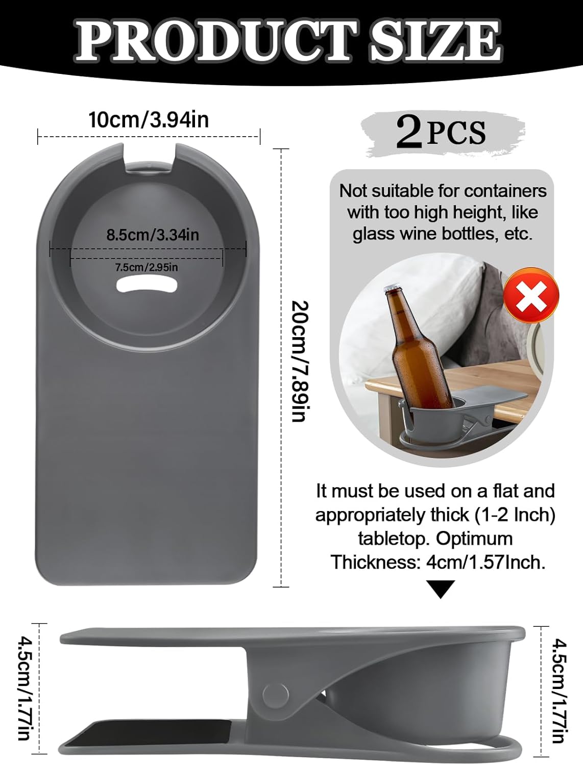 - Keep Your Desktop Tidy: This cup holder clamp has an opening of 3.3 inches and can bear 1 kg. It can be clamped on tables with 1"~2.5" thickness, and is more suitable for thicker surfaces above 4cm/1.57". It is ideal for placing drinks, mobile phones, plants, etc. In addition, it can also be used in classrooms, game rooms, hospitals, and on buses and trains. It is your right-hand helper to keep your desktop tidy!