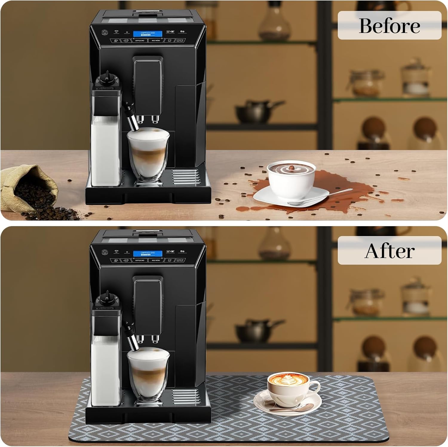 - 【Coffee Maker Mat For Countertops】Keep your coffee maker and countertops clean from spills with a coffee mat. This coffee bar mat protects your kitchen countertop surfaces from coffee splashes or coffee bean stains and can avoid the trouble of cleaning the countertops.