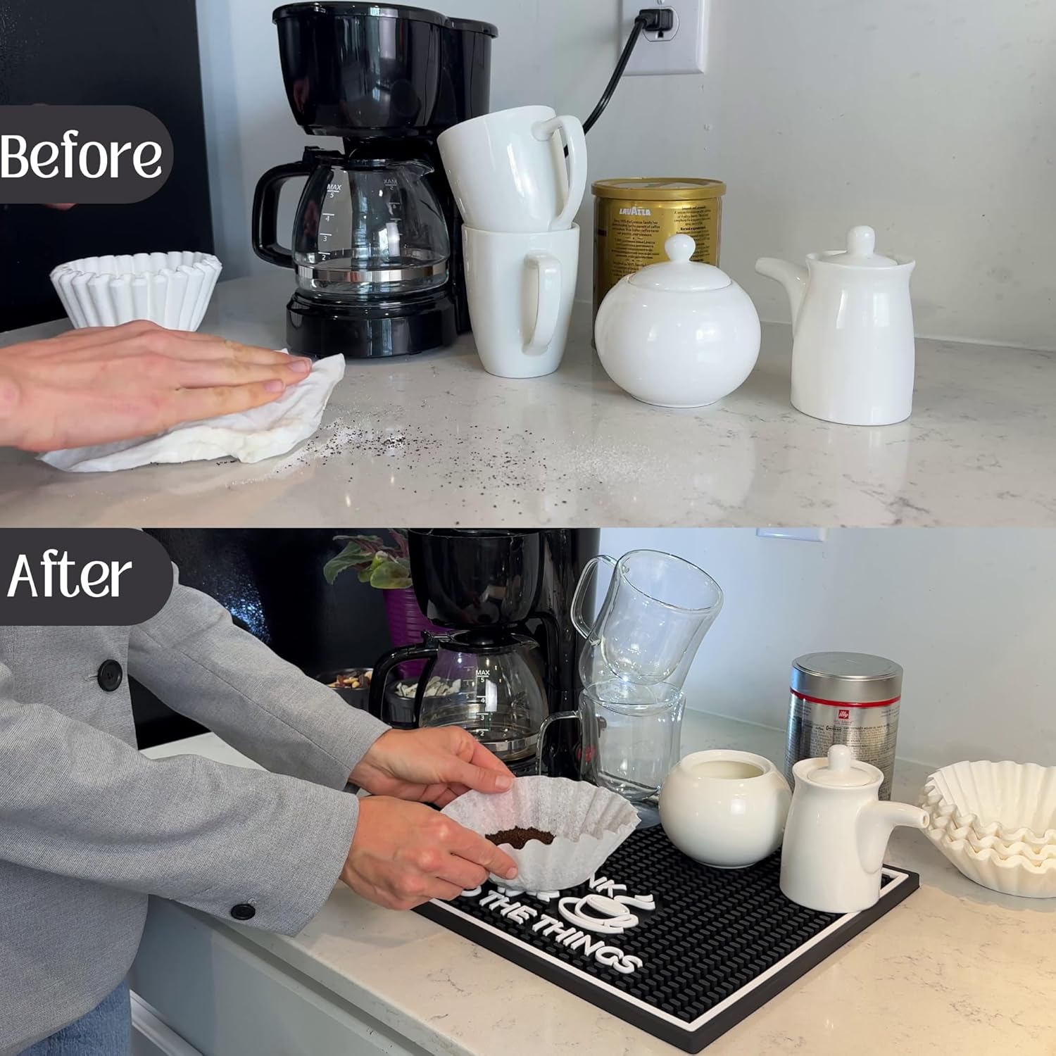 - Just the Right Size (18x12 Inches) - Big enough to catch every spill, compact enough to fit anywhere. At 18x12 inches, this coffee station mat for countertop is perfect for espresso machines, drip brewers, and single-serve makers.
