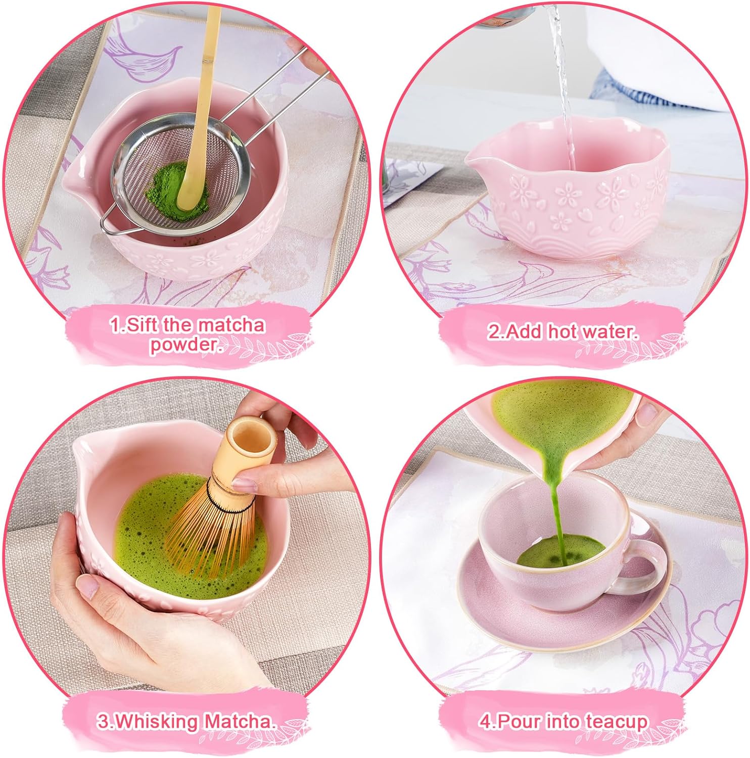 - 【Elegant Cherry Blossom Inspired Matcha Set】 Immerse yourself in the serene beauty of spring with our artistically crafted matcha kit. Designed with delicate cherry blossom motifs and a natural, textured finish, each piece resembles gracefully dancing petals. The unique wave-shaped bowl rim adds a touch of personality and elegance, making this set not just a tool for tea, but a stunning decorative centerpiece for your home.
