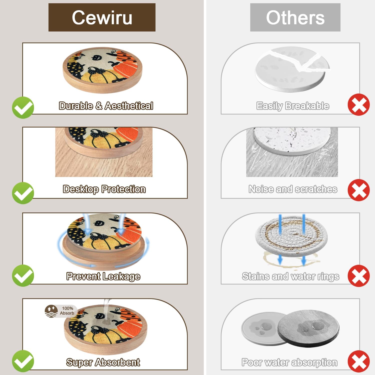 - Non-slip Bottom: Each wooden coaster comes with soft non-slip mats to prevent sliding around, and protect surfaces of furniture from hot drinks, scratches, scuffs, and spills, no excess noise; use on multiple tabletop types, like glass, wood, marble, stone, leather, agate table, etc.