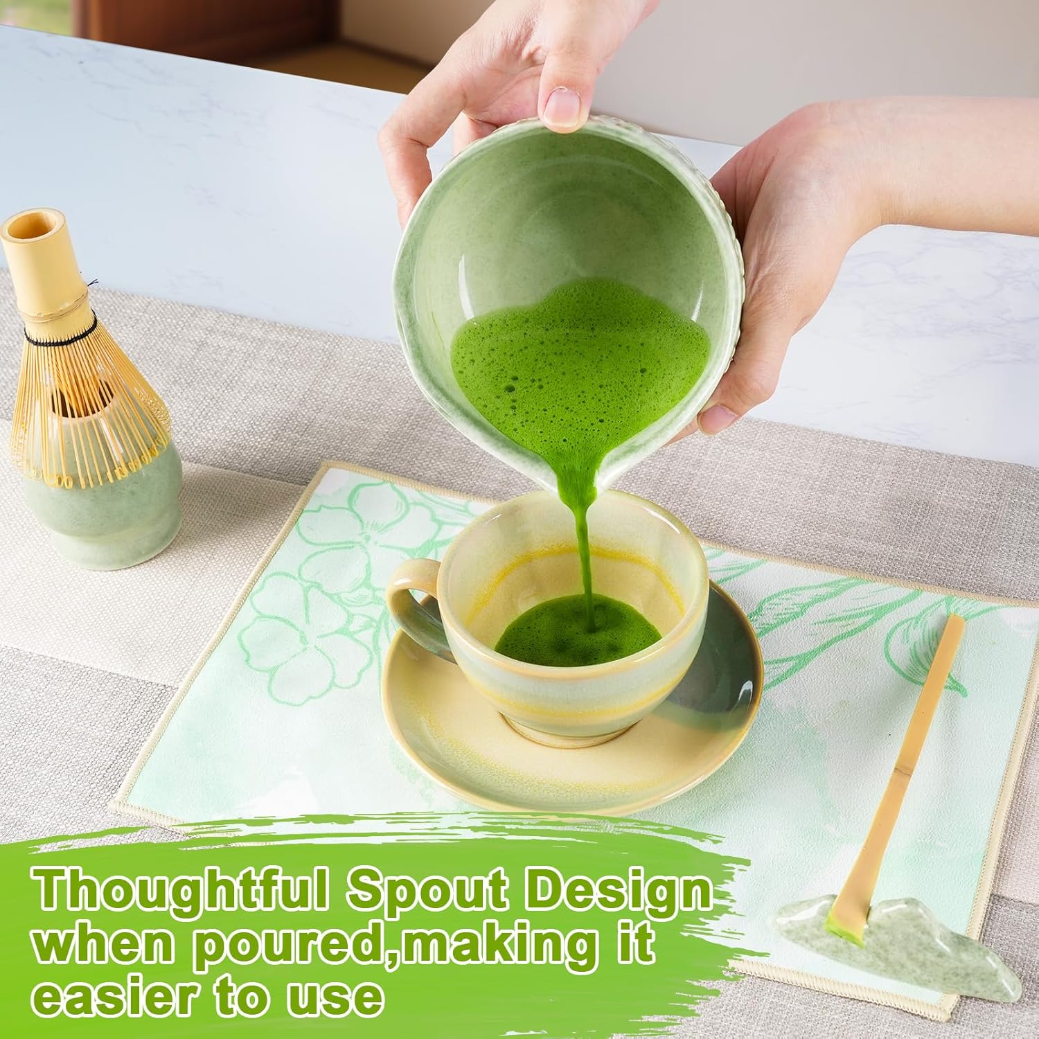 Matcha Whisk Set, Matcha Set 7 Pieces - Ceramic Matcha Bowl with Spout, Bamboo Chasen Whisk & Holder, Scoop, Sifter, Tea Towel - Complete Kit for Matcha Tea Ceremony, Latte, Ideal Gift(Mottled Green)