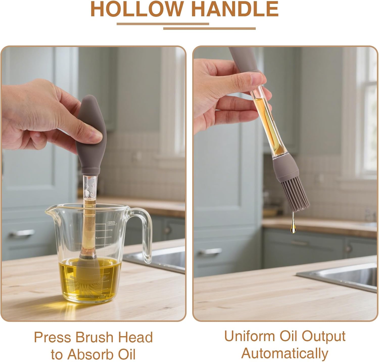 - Built-in Oil Tank: Say goodbye to messy bowls! The integrated hollow handle holds the oil, and simply press the silicone top to release a slow, even stream of oil for controlled oiling and less mess