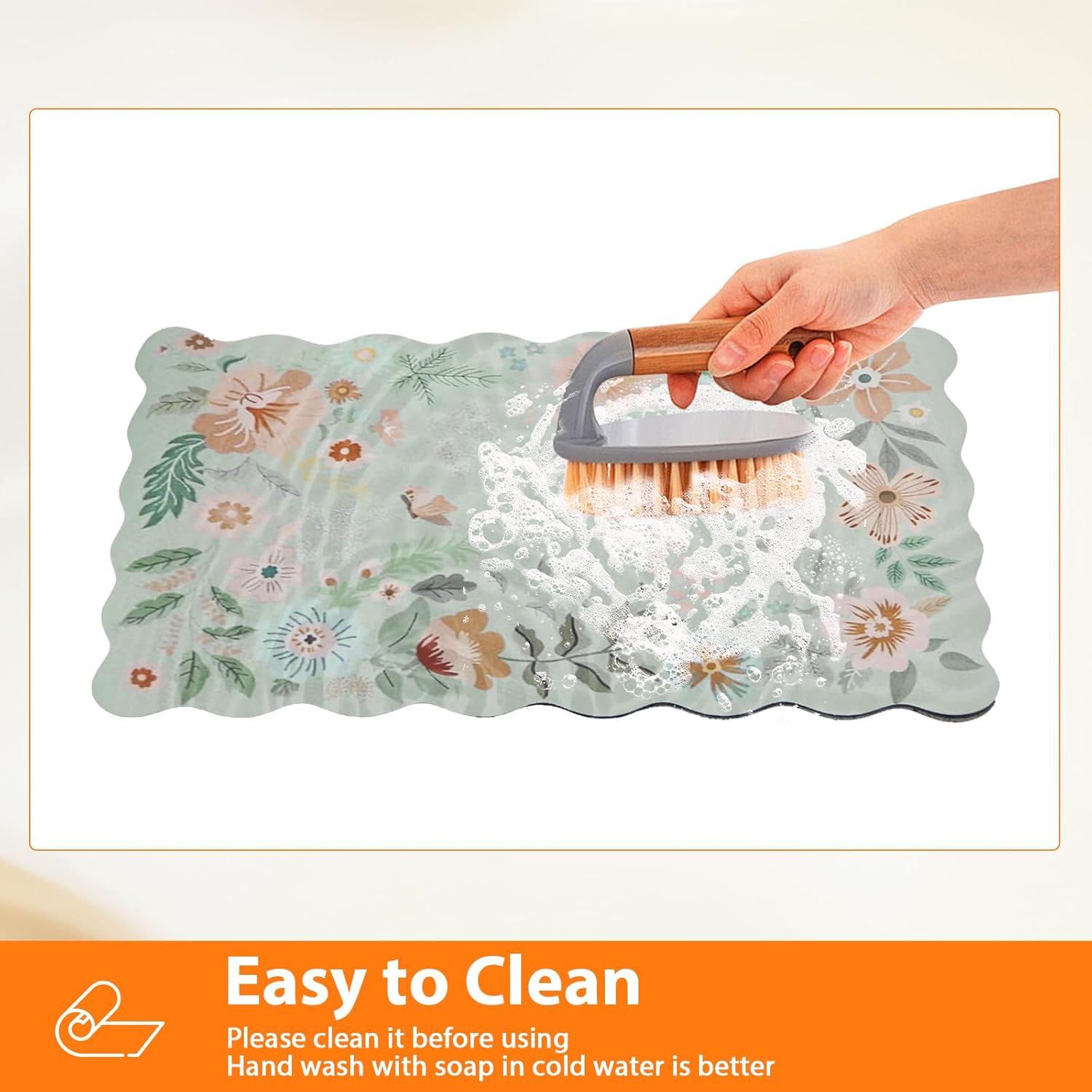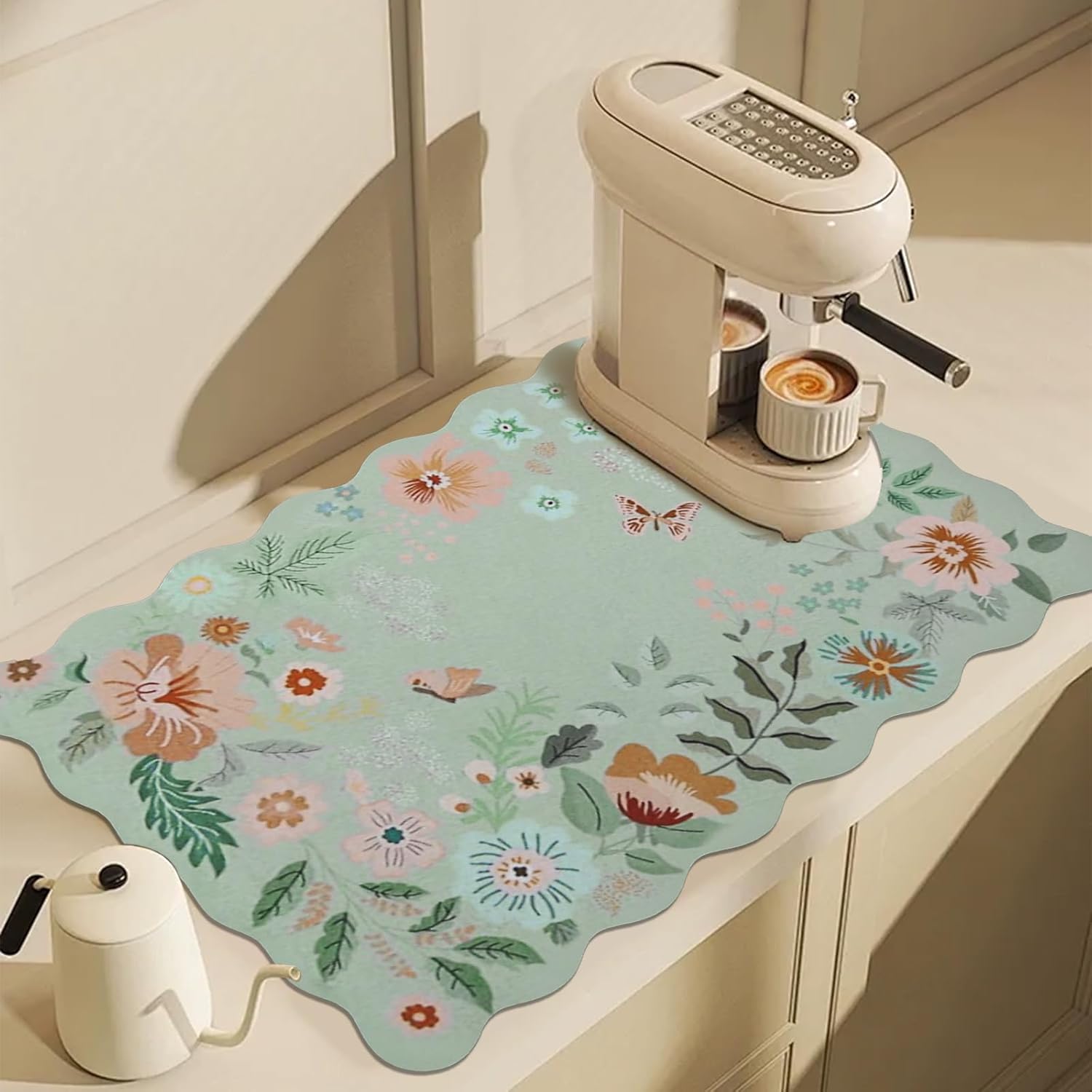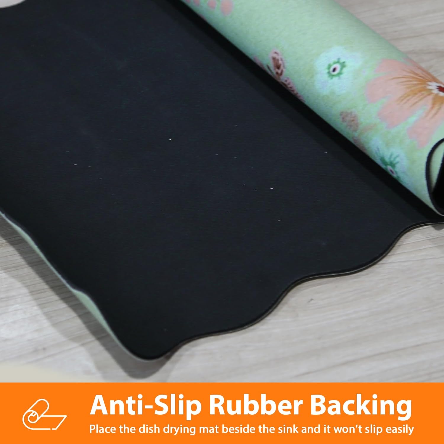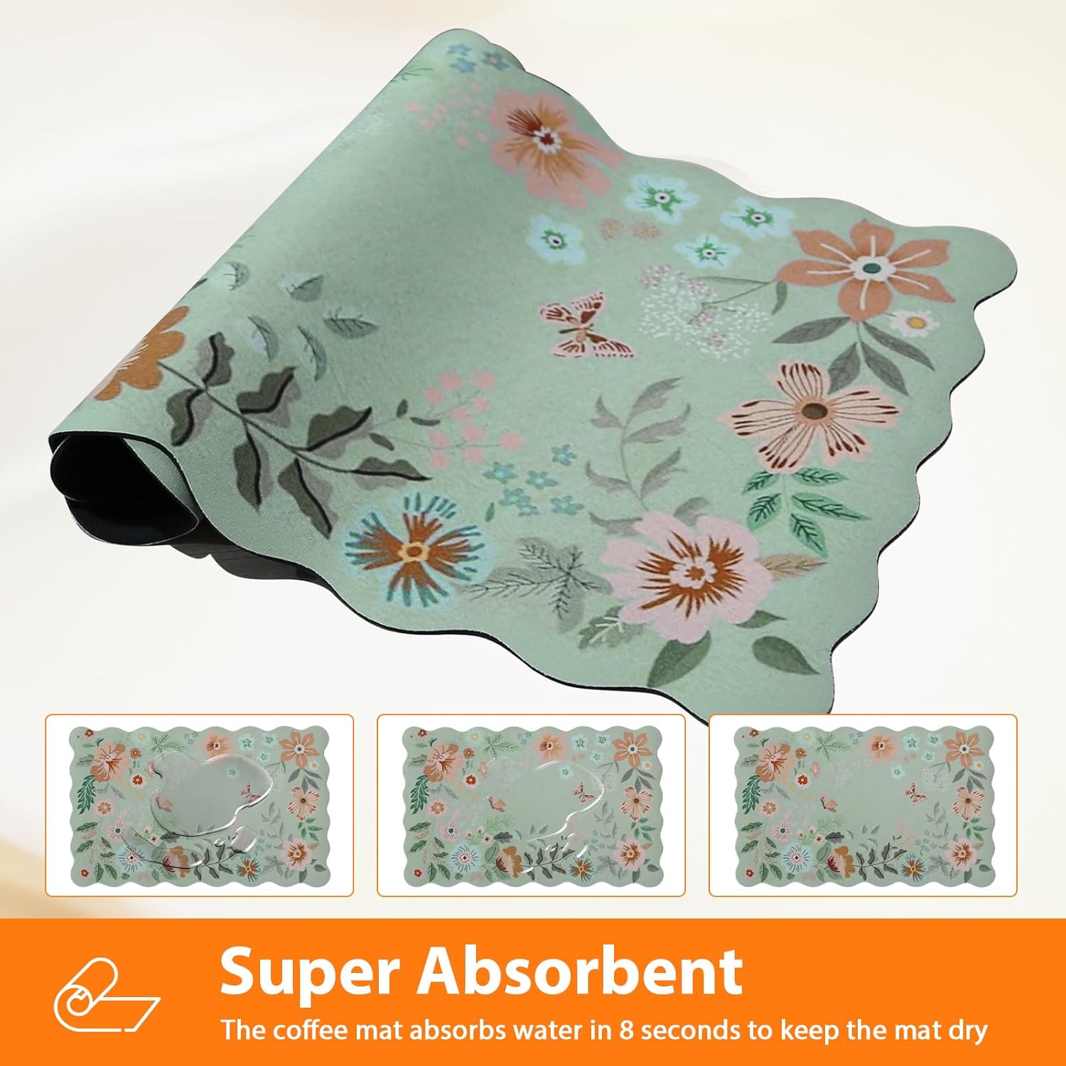 - Scalloped & Bohemian Floral Design: Pleae clean it according to our instruction in picture before using our scalloped dish drying mat. Our scalloped cute dish drying mat gives the best expression to the aesthetics. Cute, bohemian two styles in one. It can not only be used as a coffee mat, but also as a door mat, placemat, mouse pad, pet mat and even can be as a decoration for the kitchen and home, adding bright colors to your home
