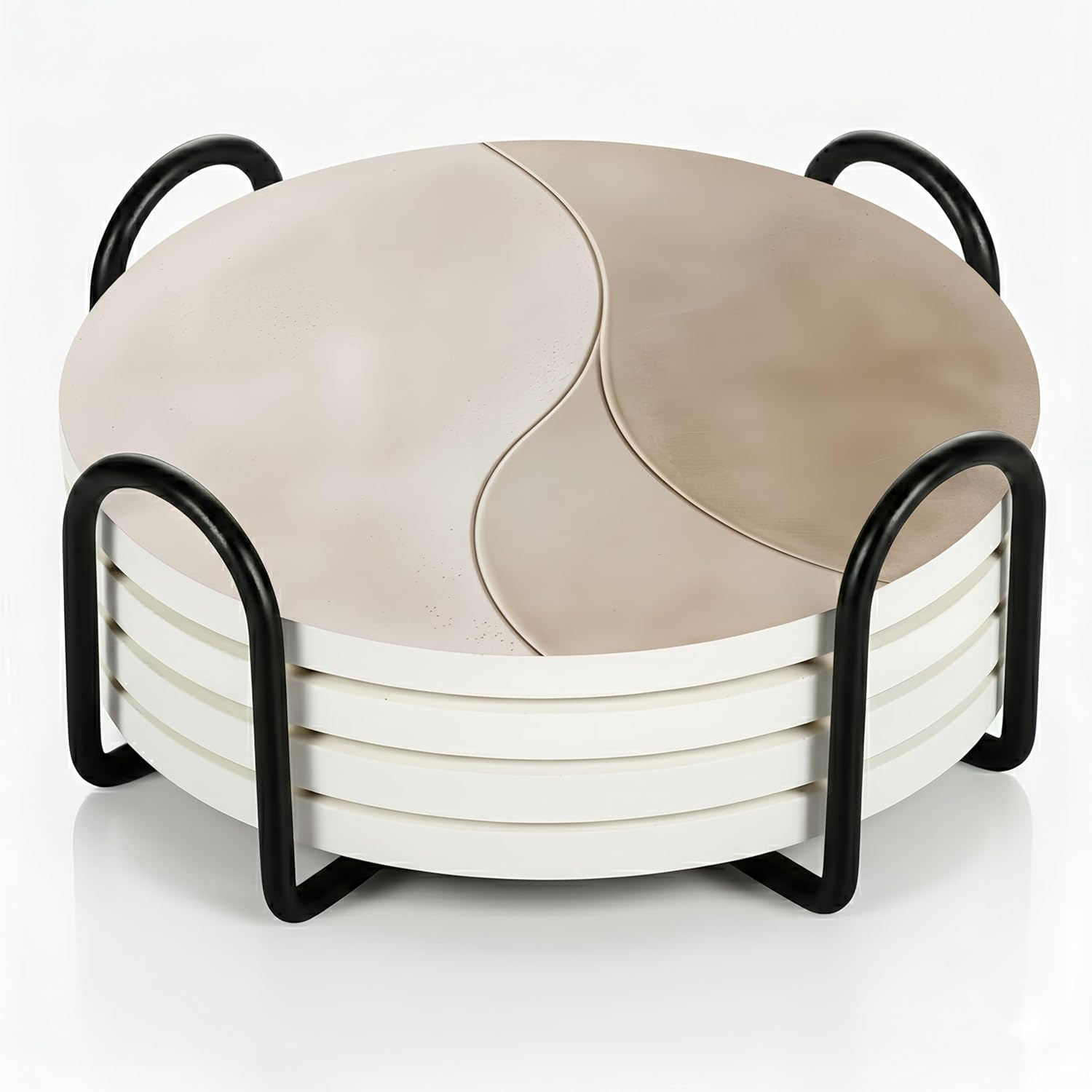 - INSIDE EVERY VEYRO SET: Each set includes 4 ceramic coasters (4" diameter, 0.28" thick) with a matte printed finish and soft cork backing that prevents slipping while creating a subtle floating effect, plus a sturdy black metal holder in smooth matte finish, all packed in a gift-ready box. The size was chosen with intention — wide enough for tumblers, mugs, wine glasses, or cocktails, yet balanced for smaller cups, candles, or planters. Each coaster carries a satisfying weight that feels premium in hand, combining elegance with everyday function to create a versatile piece that protects and decorates beautifully.