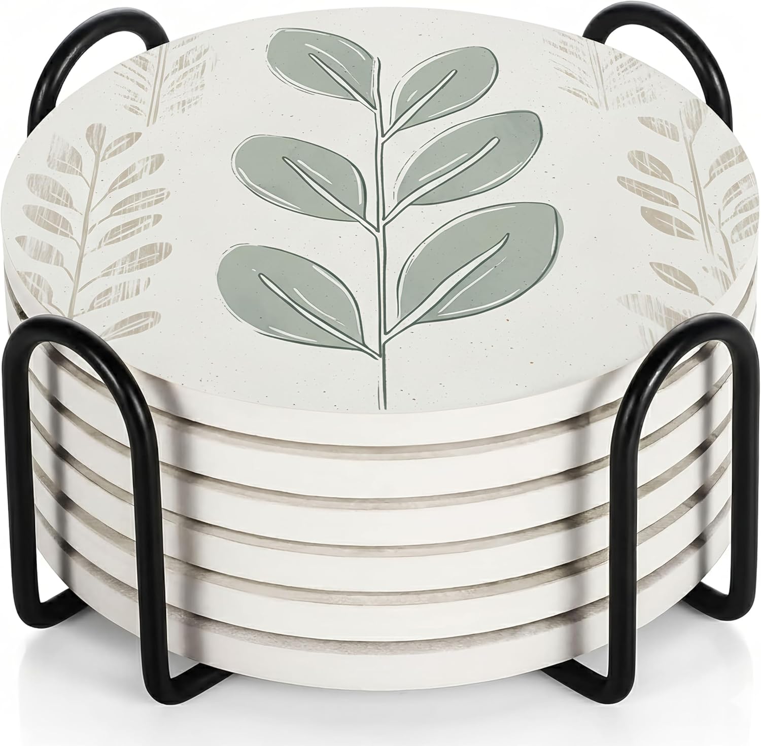 - INSIDE EVERY VEYRO SET: Each set includes 6 ceramic coasters (4" diameter, 0.28" thick) with a matte printed finish and soft cork backing that prevents slipping while creating a subtle floating effect, plus a sturdy black metal holder in smooth matte finish, all packed in a gift-ready box. The size was chosen with intention — wide enough for tumblers, mugs, wine glasses, or cocktails, yet balanced for smaller cups, candles, or planters. Each coaster carries a satisfying weight that feels premium in hand, combining elegance with everyday function to create a versatile piece that protects and decorates beautifully.