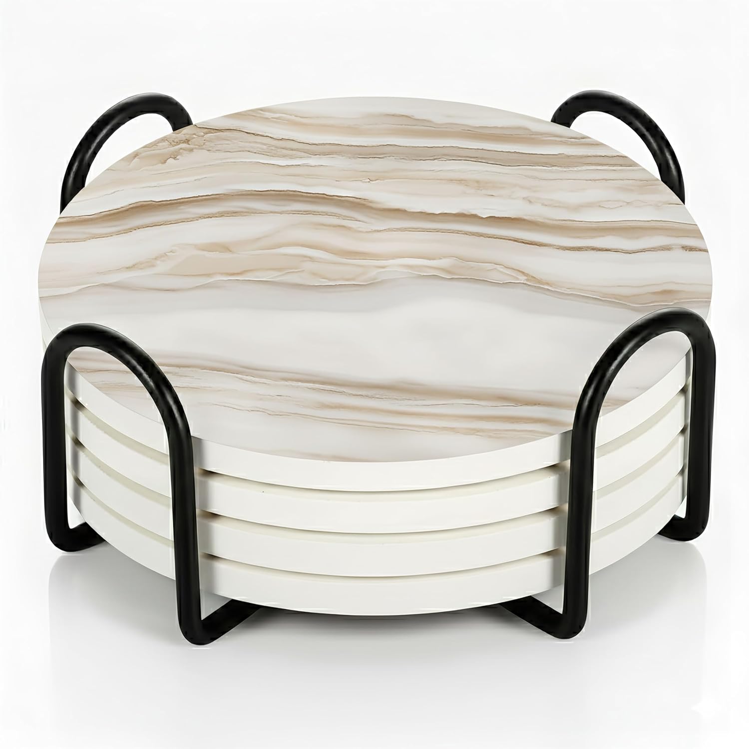 - INSIDE EVERY VEYRO SET: Each set includes 4 ceramic coasters (4" diameter, 0.28" thick) with a matte printed finish and soft cork backing that prevents slipping while creating a subtle floating effect, plus a sturdy black metal holder in smooth matte finish, all packed in a gift-ready box. The size was chosen with intention — wide enough for tumblers, mugs, wine glasses, or cocktails, yet balanced for smaller cups, candles, or planters. Each coaster carries a satisfying weight that feels premium in hand, combining elegance with everyday function to create a versatile piece that protects and decorates beautifully.
