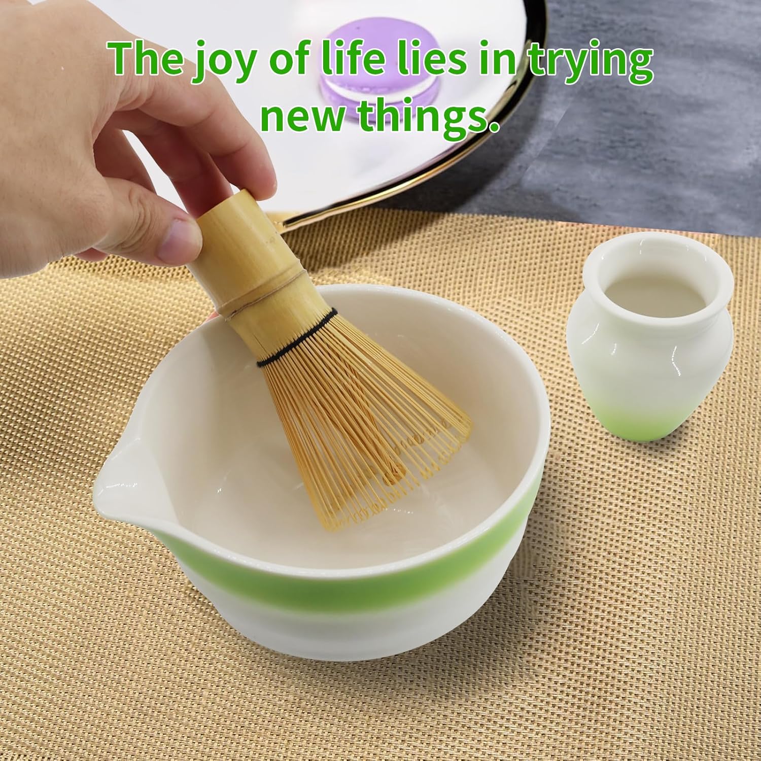- Handcrafted Ritual, Daily Zen in 5 Mins Hand-split bamboo whisk creates creamy foam. Wide bowl base lets you whisk freely. Enjoy café-quality matcha at home, any time.