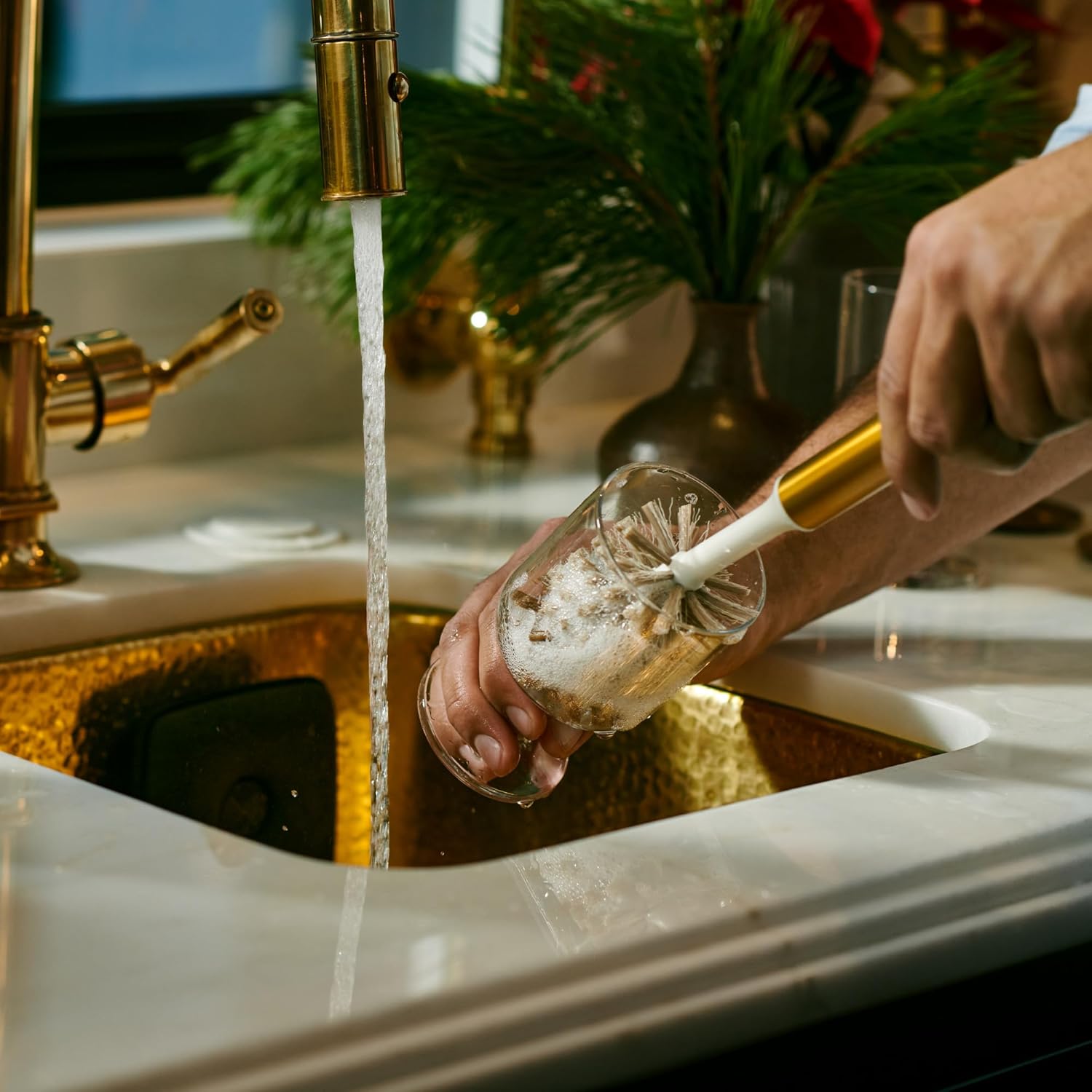 - Magnetized bottle brush stands upright for ease of use, thorough drying and stunning kitchen décor