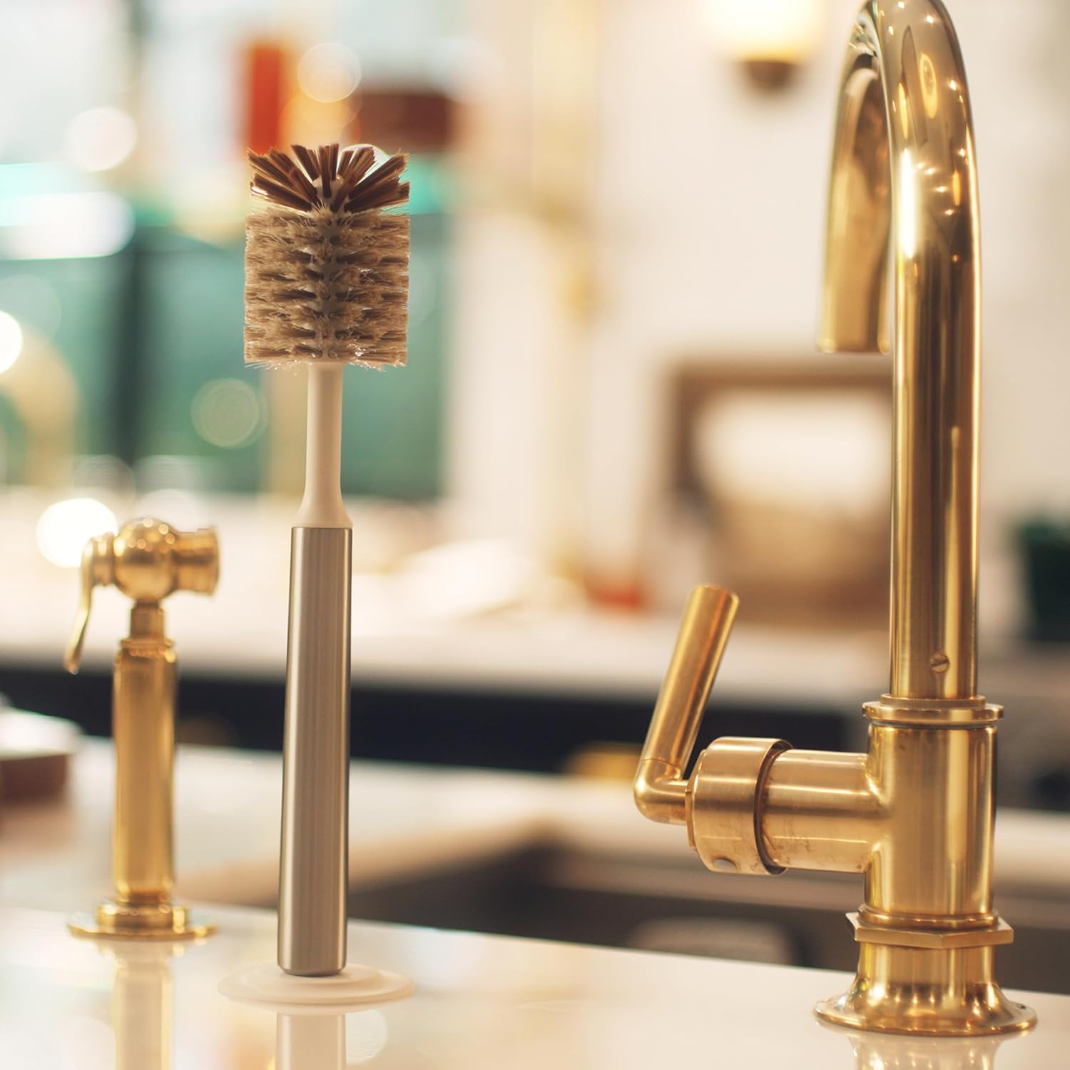 - Magnetized bottle brush stands upright for ease of use, thorough drying and stunning kitchen décor