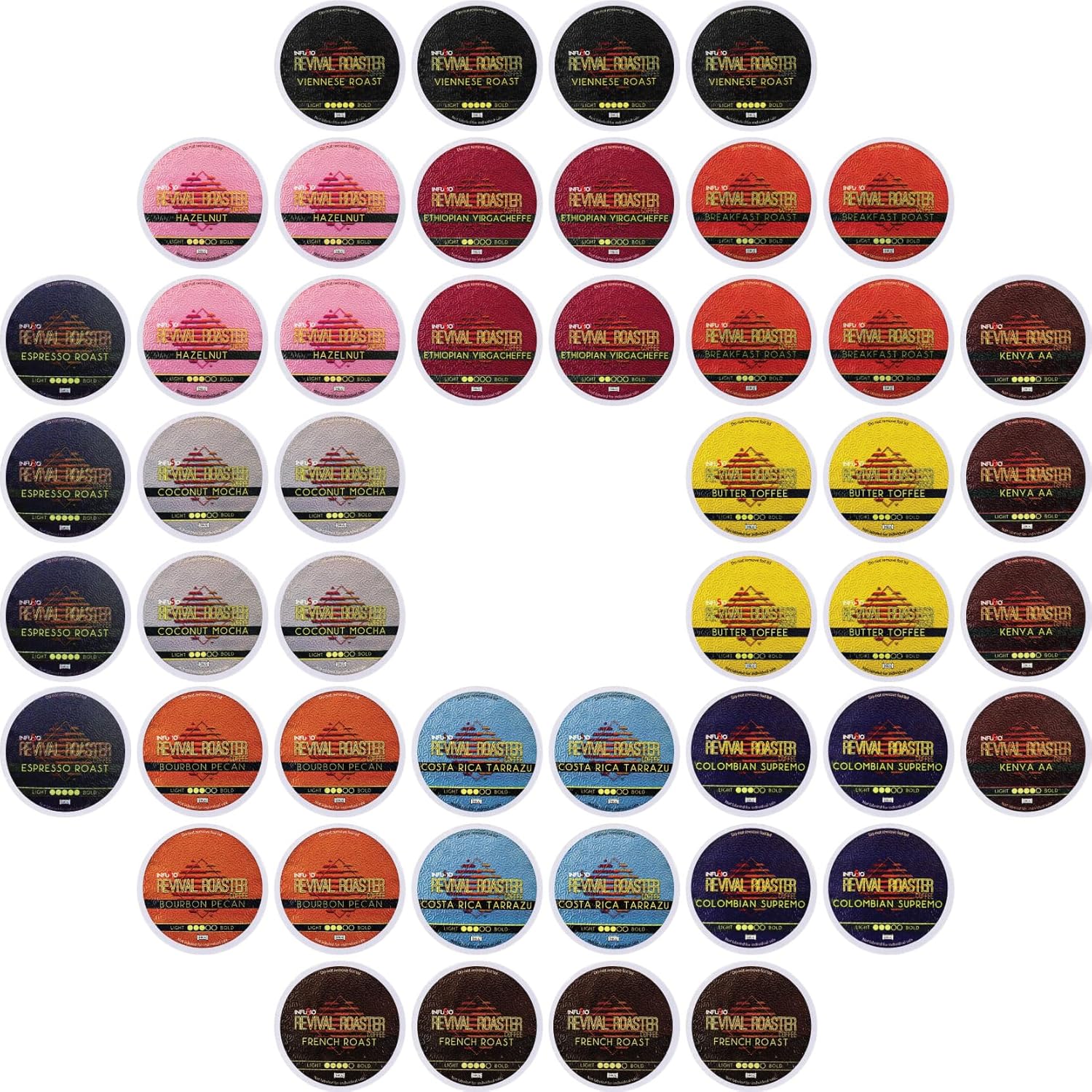- InfuSio Variety pack includes 4 pods each of the following blends: Breakfast Roast, Costa Rica Tarrazu, Colombian Supremo, Espresso Roast, Viennese Roast, Ethiopian Yirgacheffe, French Roast, Kenya AA, Butter Toffee, Bourbon Pecan, Coconut Mocha, Hazelnut! This is a true variety pack and flavors and pod distribution may vary from what is pictured.