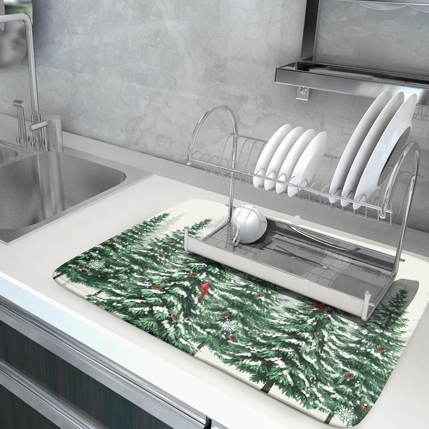 - 1【Good Material】:Our winter pine tree drying mat is made of high absorbent microfiber and the middle is made of composite spongedurable, reversible do not fade and comfortable. At the same time, it can protect your kitchen counter from scratching by the tableware.