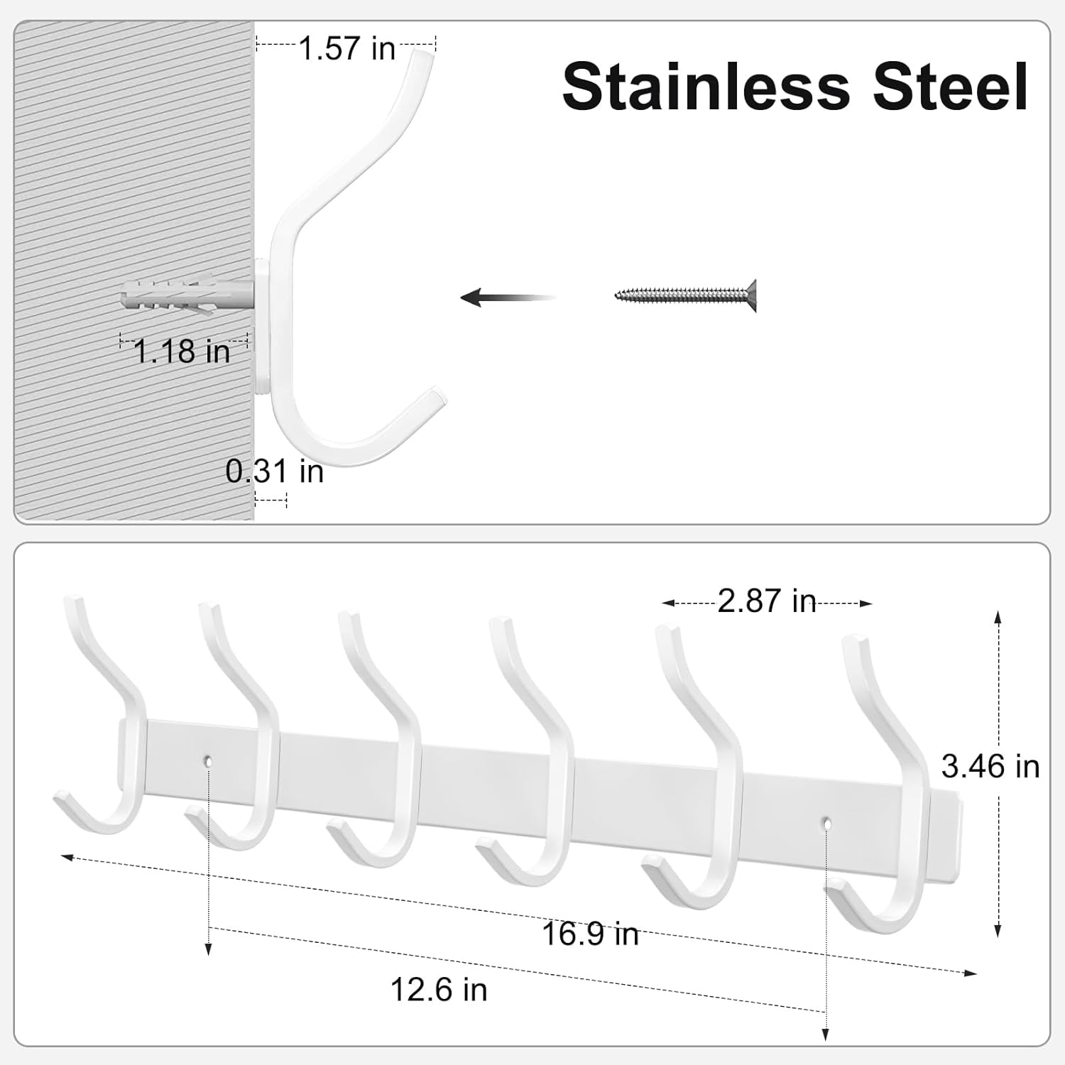 White Wall Hooks Heavy Duty, 17 Inch Coat Hooks Wall Mount with 6 Hooks,2 Packs Wall Hooks Hangers for Entryway, Bathroom - for Hanging Backpack, Bag, Coat, Purse, Hat, Towel, Clothes