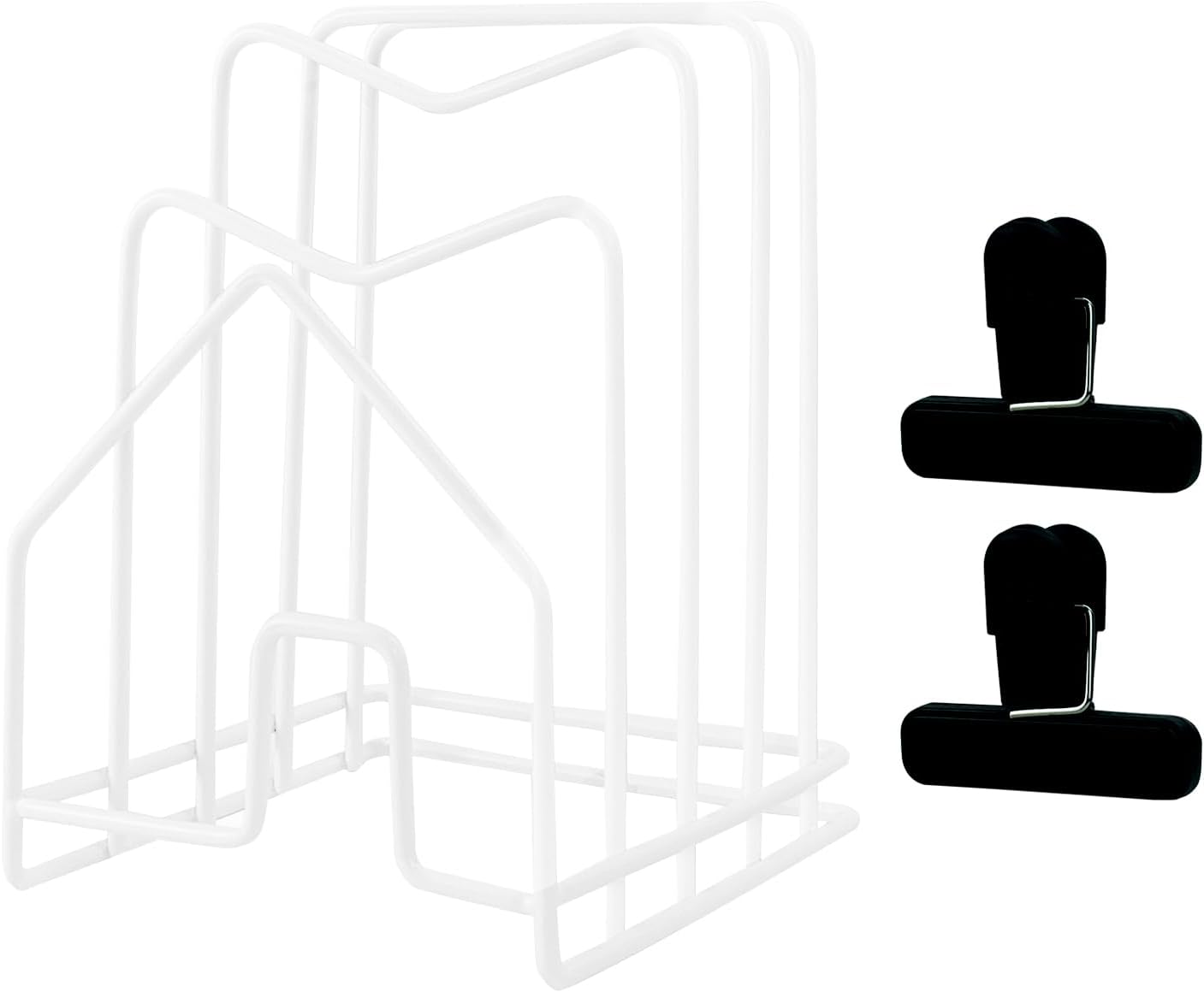 - CUTTING BOARD HOLDER FLEXIBLE USES: securely holds cutting boards, chopping boards, pots or pans lids, plates, cookie sheets, muffin tins, shovels, spoons and recipe books and so on. COMES WITH 2 CHIP BAG CLIPS FOR EASY FOOD STORAGE TOO