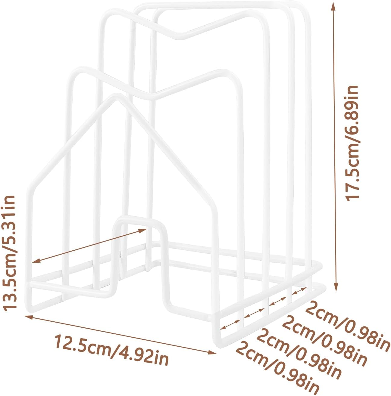 - COMPACT & CONVENIENT POT LID ORGANIZER: 4.92IN.(Length) x 5.31IN.(Width) x 6.89IN.(Height); This pot lid holder with 4 divivers is super compact yet accommodates cutting boards or lids sized up to 0.98in. wide