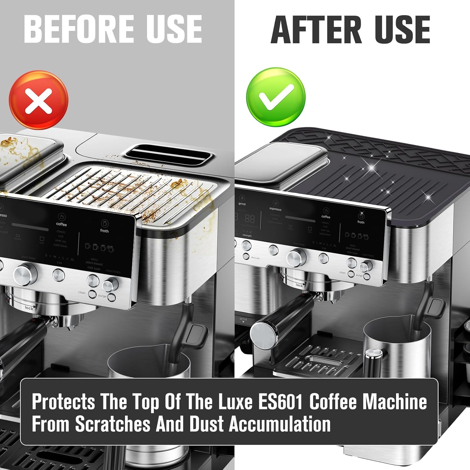 - Prevent Scratches & Dust Accumulation: This premium espresso machine top mat features full-coverage protection, forming a soft barrier to shield the Luxe ES601 top from scratches, wear, and dust buildup. Easy maintenance keeps your coffee machine looking like new