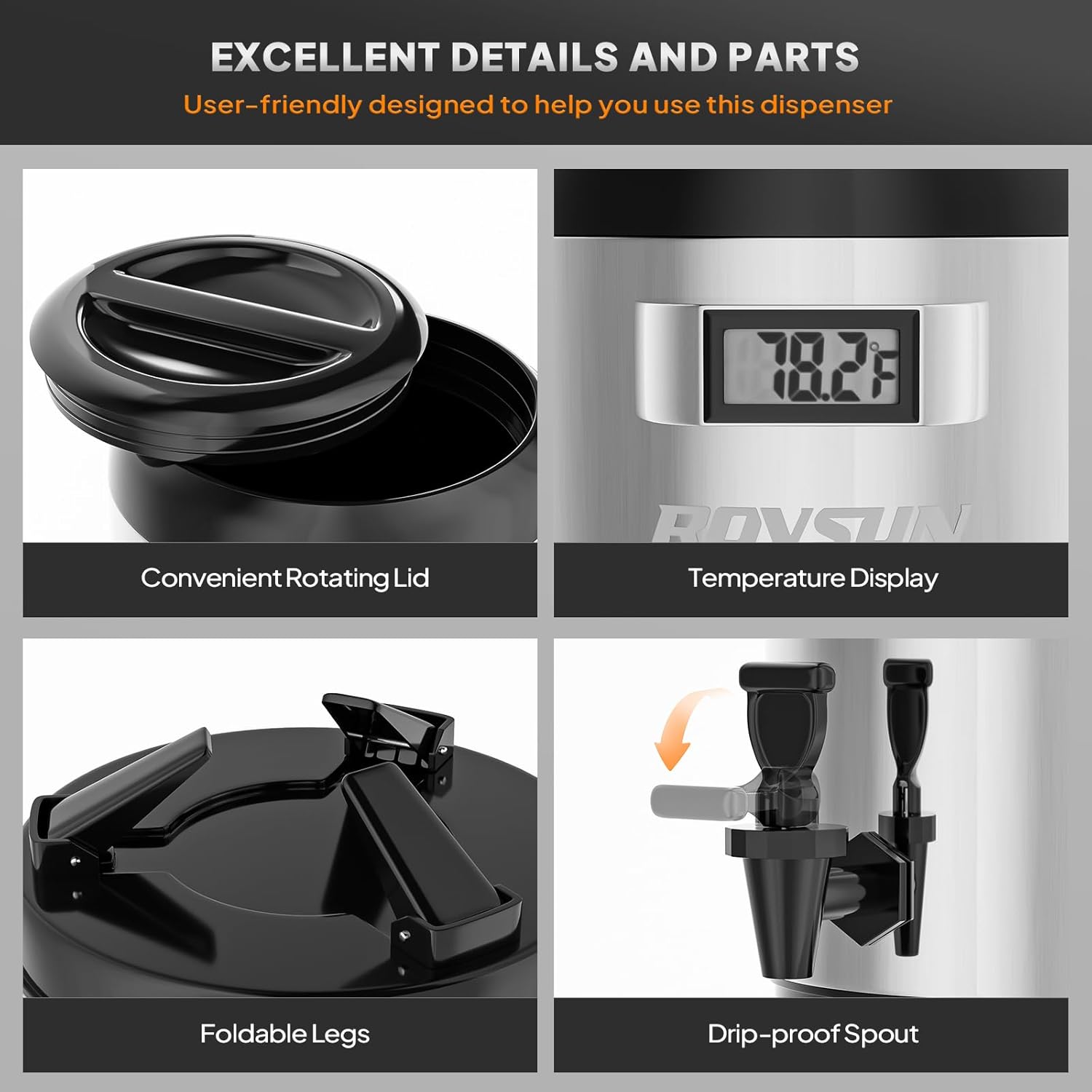 - 【Advanced Stainless Steel Construction】 Made with durable and rust-resistant stainless steel inside and out, this drink dispenser ensures safe storage and easy cleaning. The anti-slip base, secure lid, and ergonomic handle make it both functional and move-friendly for fast-paced settings