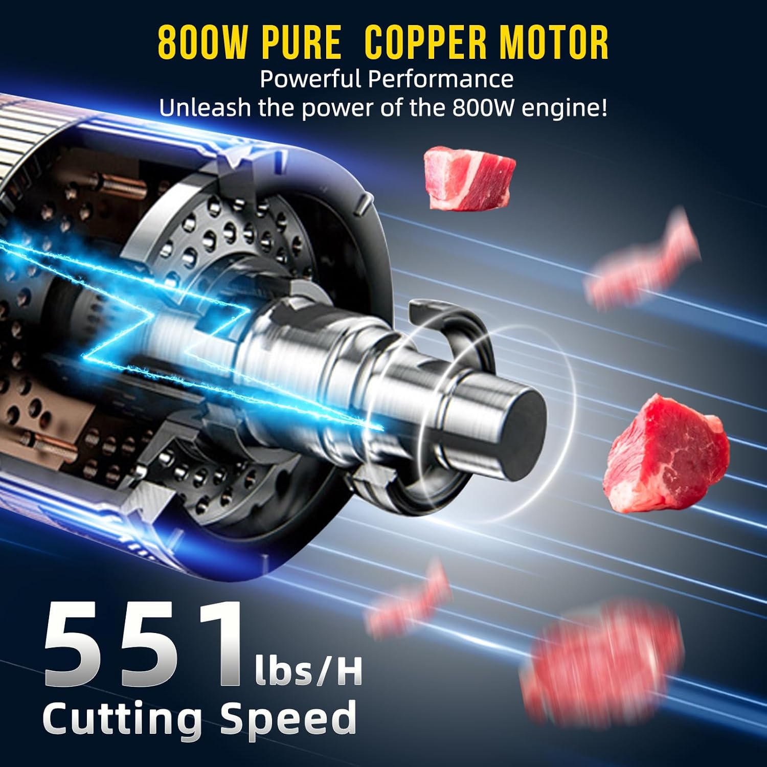 - 800W High-Power Motor: 551 LB/H Efficient Cutting (Low Noise):Powered by an 800W motor (1700 rpm), this electric meat cutter machine achieves a cutting speed of 551 LB/H, turning large batches of meat into sliced portions in minutes—ideal for busy kitchens. It also combines nylon gears (for low-noise operation, no disturbing loud sounds) and metal gears (for long-term, stable performance), balancing efficiency and durability.