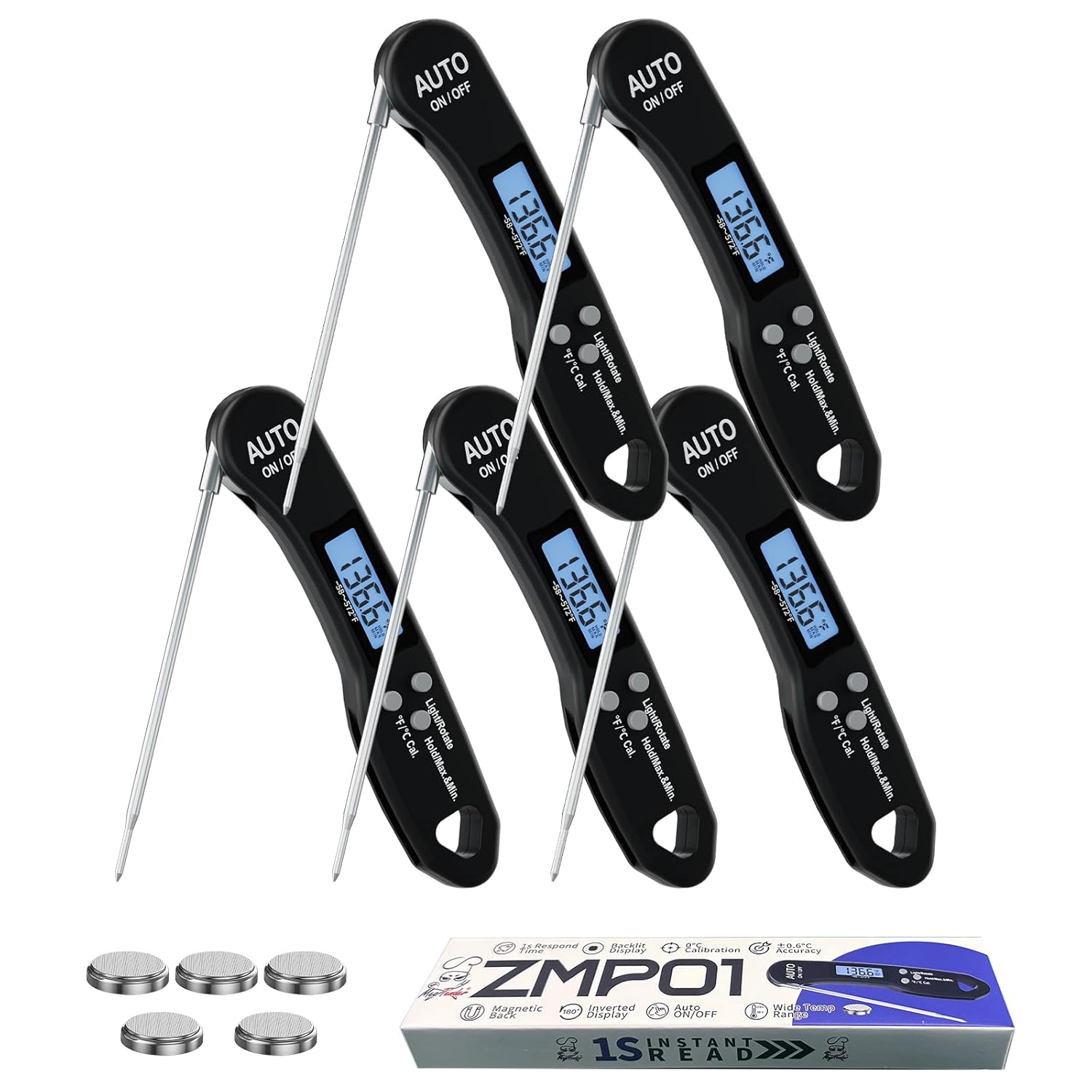 5 PCs Digital Food Thermometer with Fast 1-Second Reading, ±1°F Accuracy, -58°F to 572°F Range | Foldable Probe, Magnetic Back, Backlit LCD, Auto-Off for Grilling, Baking, Smoking