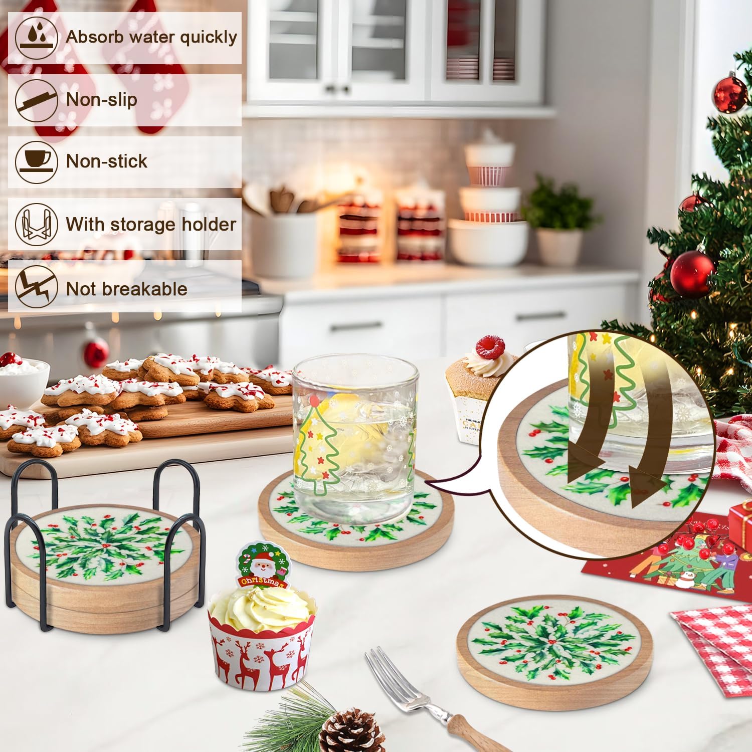 Christmas Coasters Set of 4 with Holder, Cewiru Cup Mat for Drinks, Absorbent Coasters with Felt Insert for Coffee Table Protection, Modern Style Home Dining Table Decor, 4.3"