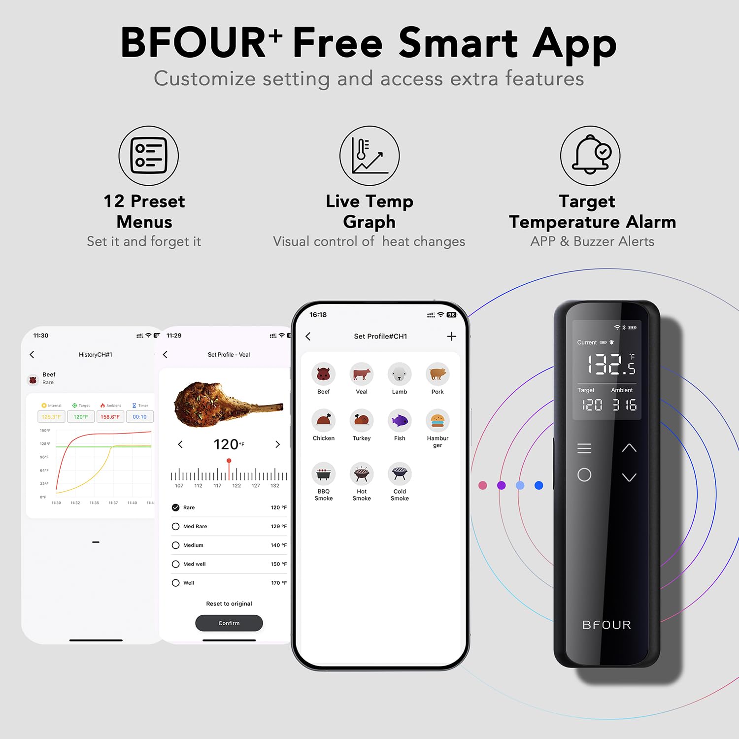 - 【Intuitive Smart App】Track real-time temperatures with this intuitive smoker thermometer app. Set target temperatures, customize alarms and timers, and view temperature graphs right on your phone. USDA meat presets make grilling and smoking easier than ever.