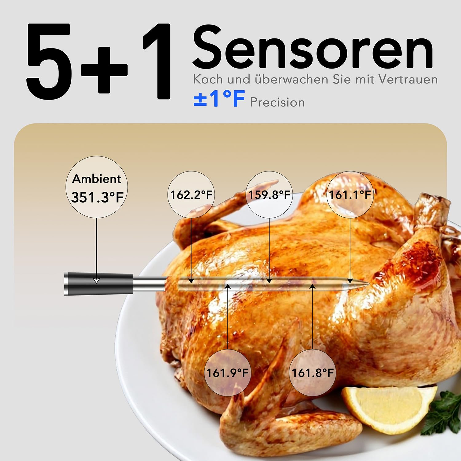 - 【5 High-Precision Sensors & Ambient Sensor】This wireless meat thermometer probe features 5 internal temperature sensors and 1 ambient sensor, all with an accuracy of ±0.9℉. Perfect for monitoring multiple types of meat and your grilling environment simultaneously. Get precise, reliable temperatures every time with this Bluetooth meat thermometer.