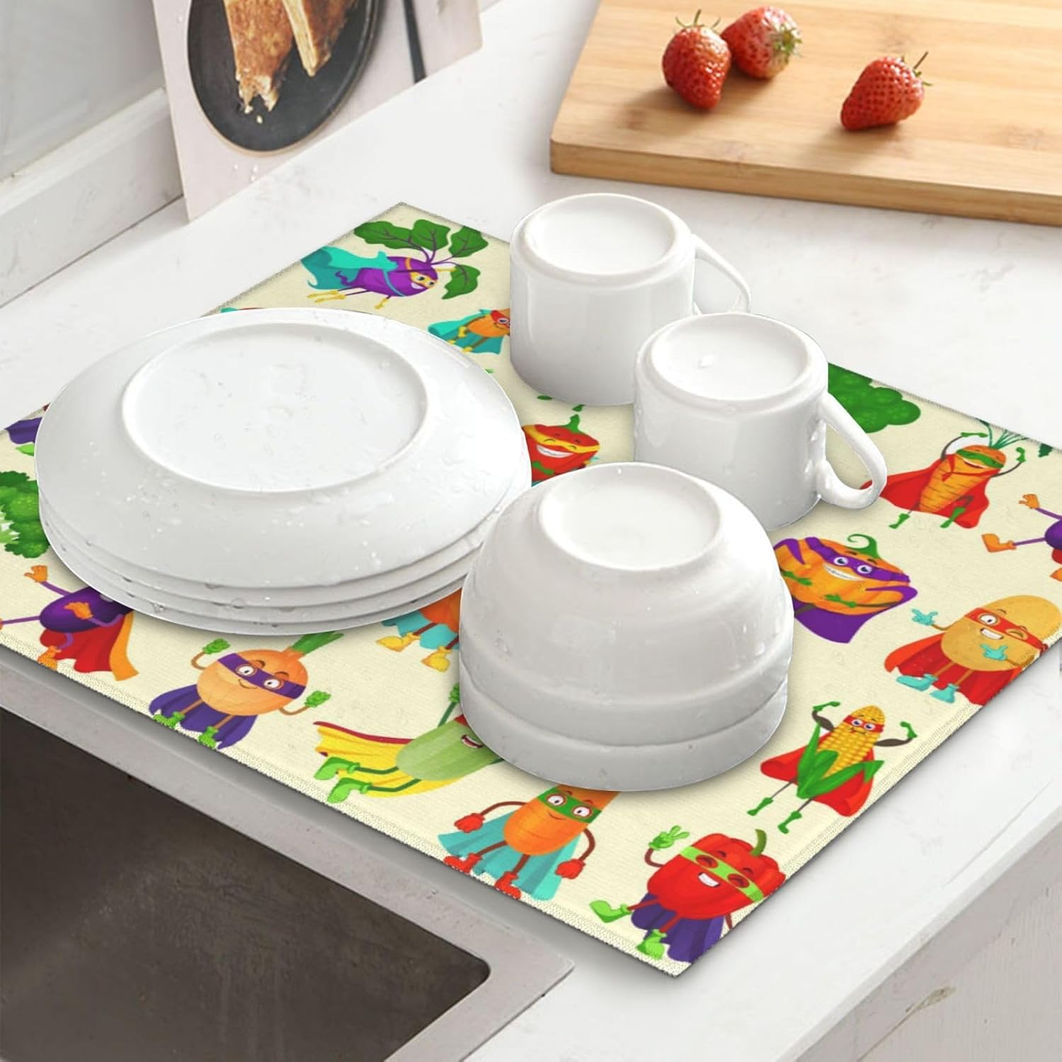 Vegetable Superhero Cartoon Dish Drying Mats for Kitchen Counter, Absorbent Microfiber Cute Drying Pad for Dishes, Decorative Kids Kitchen Mat for Sink, Dishes Utensils, Dining Area, 16" x 18"
