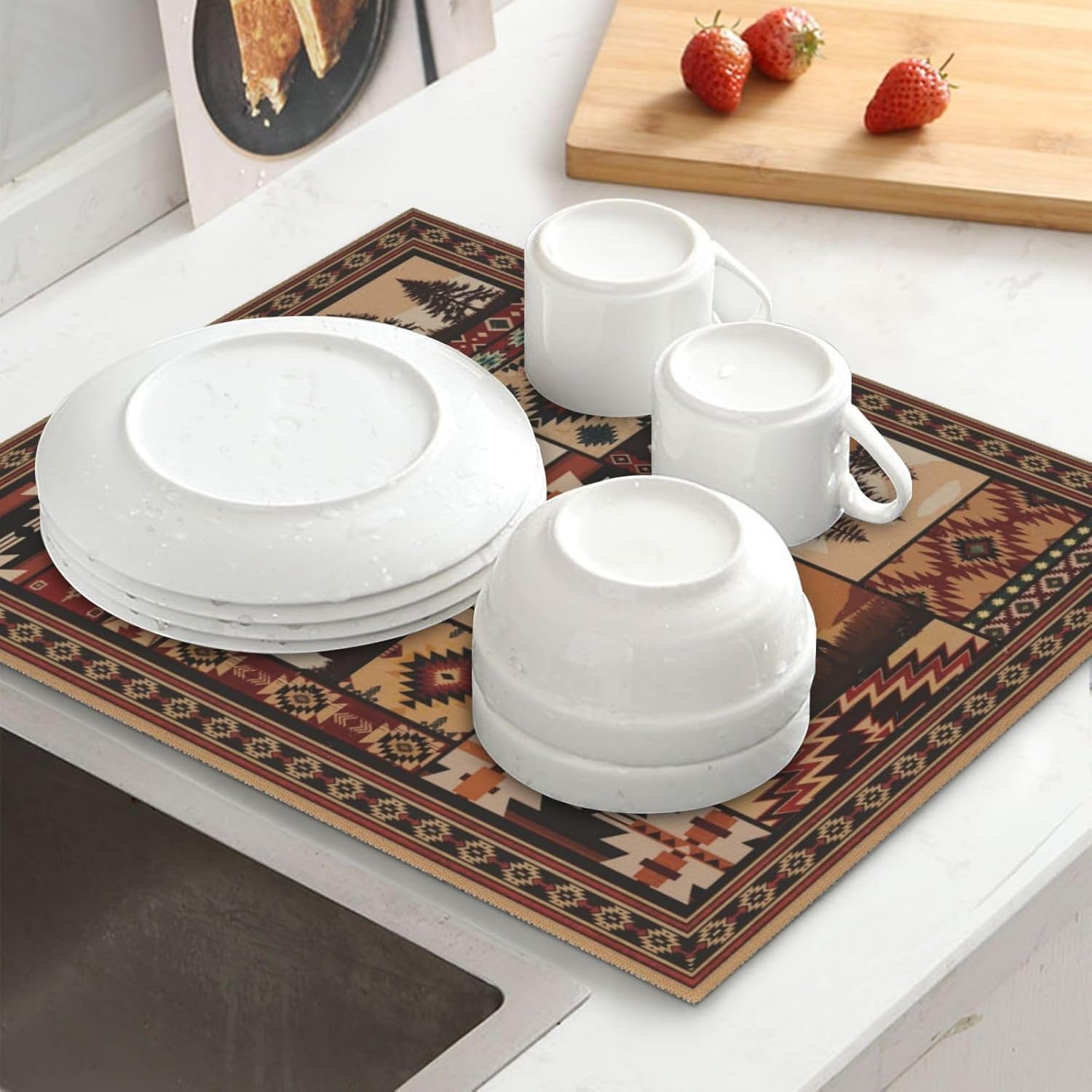 Western Wildlife Geometric Dish Drying Mat for Kitchen Counter, 16" x 18" Absorbent Microfiber Foldable Drying Pad for Dishes, Absorption, Washable, Decorative Rustic Kitchen Mat for Sink, Home Decor